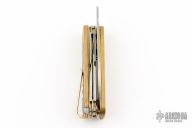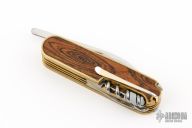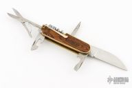 This 91mm SAK by Victorinox has been customized by Master Select. It has a main blade with friction folder style opening, cork screw with mini flat head inside, carry hook, leather awl, scissors, bottle opener, flat head, and a can opener. The handle has rosewood scales inlaid in a brass frame, brass escutcheon, brass liners. Has a couple light scratches, otherwise excellent condition. This knife is "Reverse Built" so the main blade can be used with the right hand.