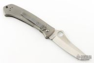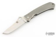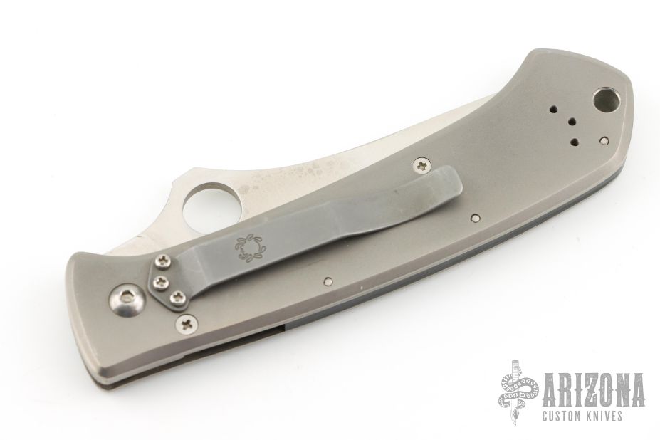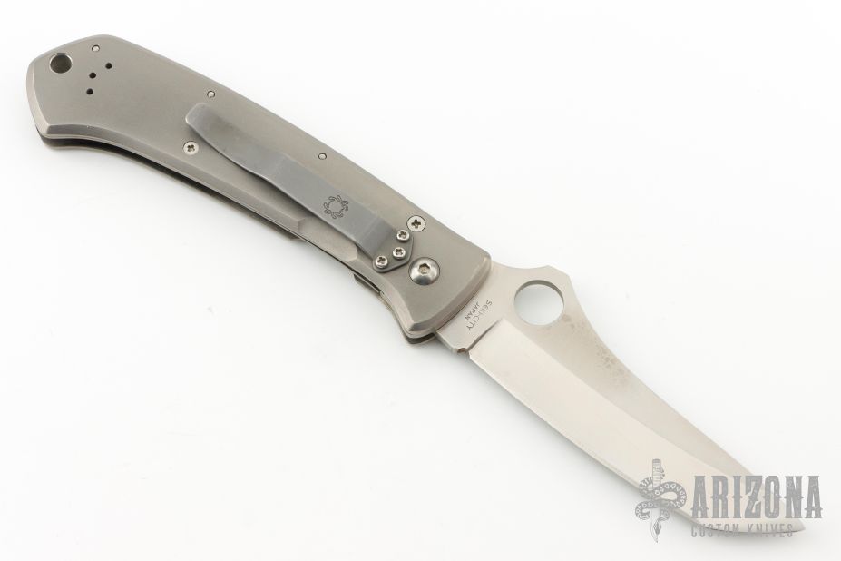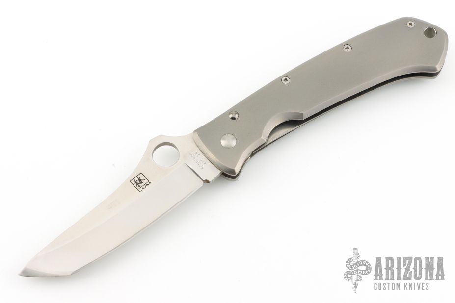 This Bob Lum designed folding knife by Spyderco features a tanto style blade marked with the Lum Logo and numbered 471.  The handle features titanium scales and a bead blasted tip up/down pocket clip. Nice detent, lockup and blade seating. Has some scuffs and scratches, great condition otherwise.
