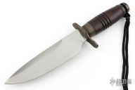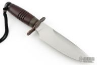 This Fighter by Tai Goo features a hand rub satin finished blade with .203" blade stock and 1.917" blade depth, hidden tang construction. The handle has a darkened and nicely contoured copper S-shaped guard, beautiful fluted wood grip, and textured spacer and bronze butt. Comes in a zipper case. Has a couple light scuffs, and some very light oxidation spots on the blade, excellent condition otherwise. Could use a little TLC. Marked "Goo" and "10/100" under the guard on the spacer.