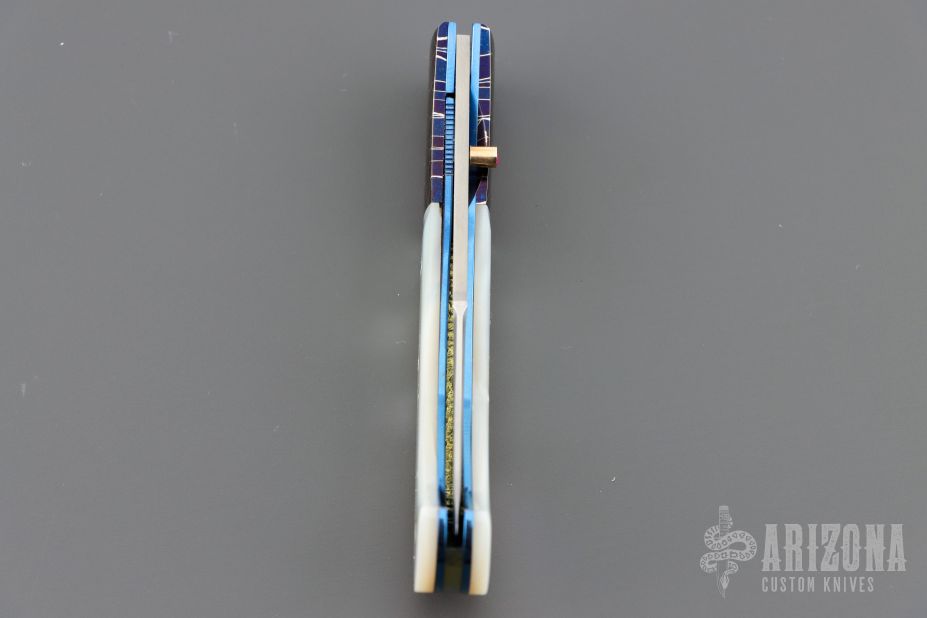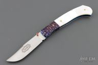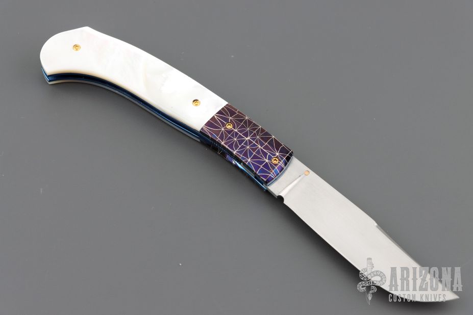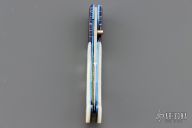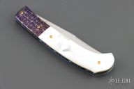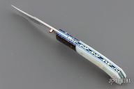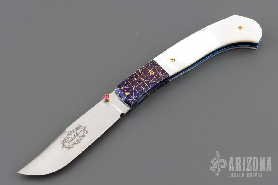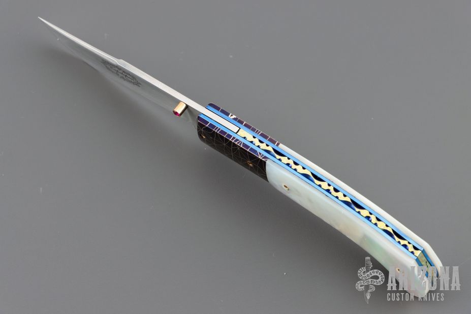 This linerlock folder by Robert Capdepon features a hand rub satin finished blade with single ruby inlaid gold thumbstud. The handle has blued mosaic Eggerling Damascus bolsters, mother of pearl scales, anodized titanium liners, fileworked and anodized titanium backspacer. Smooth action with a nice detent, lockup and blade seating. Excellent fit and finish. Excellent condition. Comes with a zippered case and makers card.