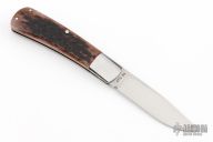 This slipjoint by Ray Cover features a hand rub satin finished blade with a nail nick. The handle has dovetailed and polished 416 stainless steel boslters, jigged bone covers with red liners and nickel silver pins, stainless steel liners and spring. Has half-stop, flush in the open and closed positions. Has a few light scratches, otherwise excellent condition. Comes with a zippered case and COA.