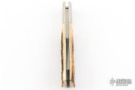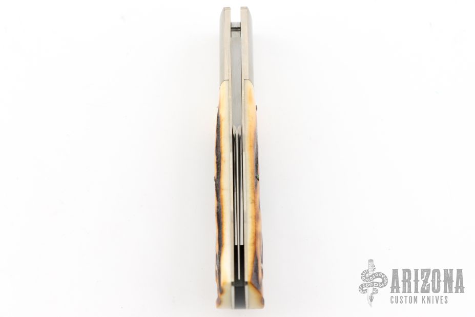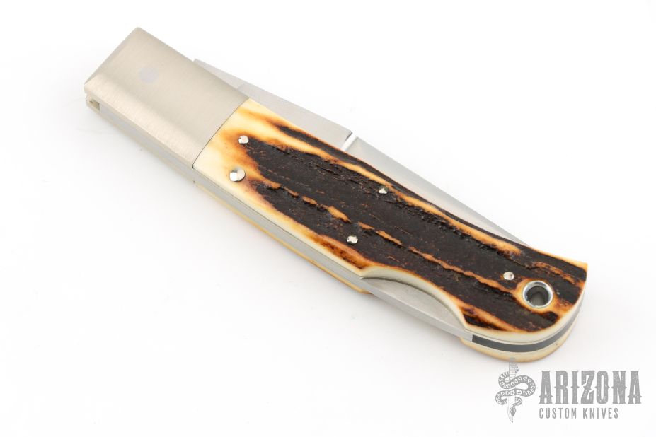 This stunning lockback folder by the late Jess Horn features a hand rubbed satin finished clip point blade with false top edge and nail nick. The handle has nickel silver bolsters with beautiful stag scales, hand peened nickel silver pins, and nickel silver liners. Satin finished stainless steel backspacer, black linen micarta spacer at the butt, and butt of handle has lanyard hole. All the lines of this knife line up perfectly. It is a truly beautiful knife. Numbered 193. Flush lockup and nice blade seating. Excellent condition. Comes with a zippered case.