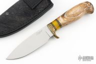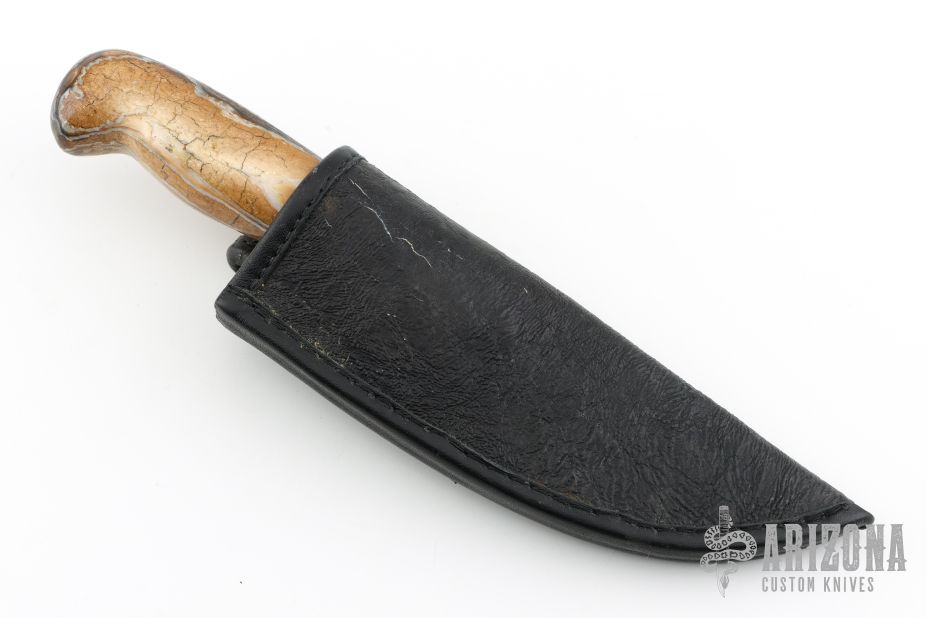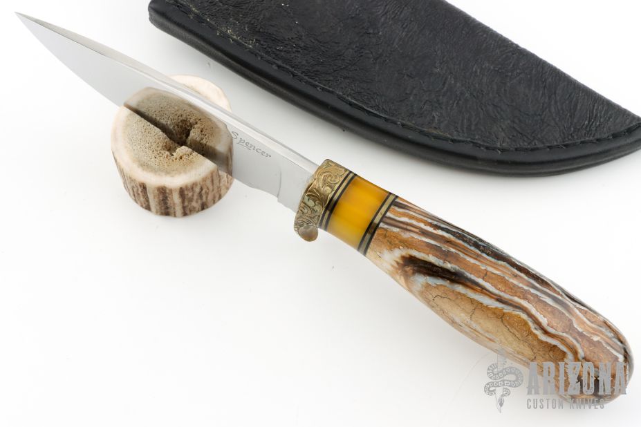 This Hunter by Tiny Spencer features a mirror polished drop point blade, .174" blade stock and 1.464" blade depth, hidden tang construction. The handle has an engraved brass guard, fossil mammoth tooth grip, black/brass/amber spacers. Includes a padded zippered case, black leather sheath and papers. Has som light scratches, otherwise excellent condition.