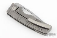 This knife by the OZ Machine Company features a tumbled Magnacut blade with thumbhole and notched thumbrest. The handle features a MAG milled titanium frame with a titanium backspacer and tip up pocket clip with hidden screws. Includes box and papers dated 1-10-24 and s/n 2815. Excellent condition.