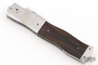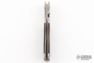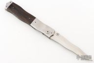 This liner lock by Mel Pardue features a Kris style blade with single knurled thumbstud. The handle has satin finished stainless bolsters, liners, and backspacer. The handle has wood inlays and jeweled interiors. Nice detent, lockup and blade seating. Comes in a soft pouch. Has some light scuffs, excellent condition otherwise.