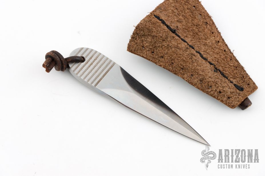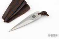 This Thumb Dagger by HG Long and Co features a satin finished double edged blade and handle, .138" blade stock and .660" blade depth, integral construction. Comes with a black leather wallet sheath that can be sown into clothing. Excellent condition.