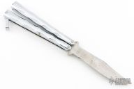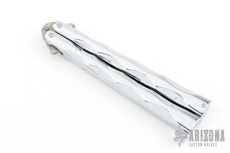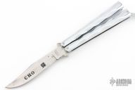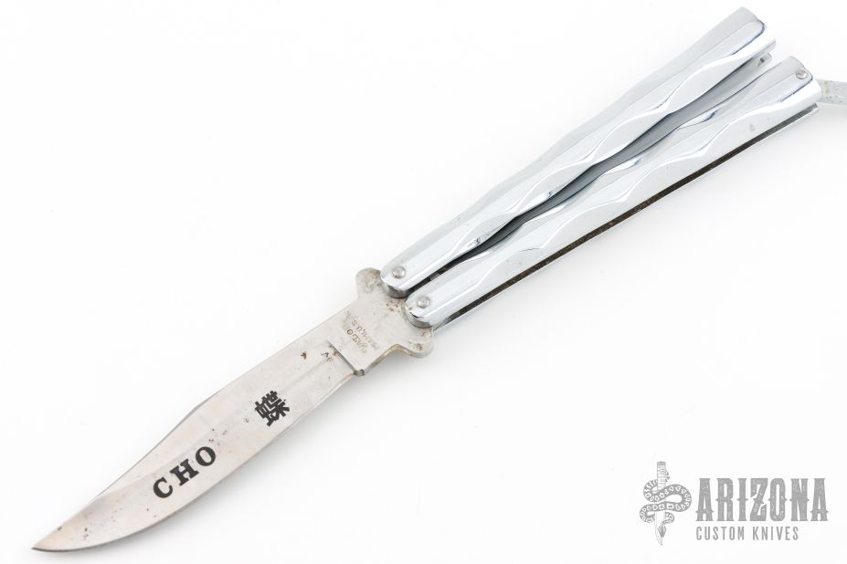 This CHO Balisong by Valor has a satin finished blade. Diecast metal handles. Has some scuffs, scratches, and some light rust spots. Good condition otherwise.