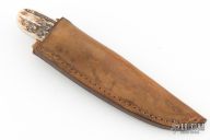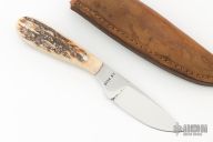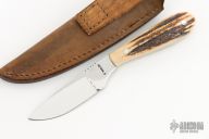This Utility by Manley has a mirror polished blade with notched thumbrest, .125" blade stock and .925" depth, full tang construction. The handle has stag scales with nickel silver pins. Comes with a brown leather sheath. Dated '05 and #4300. Excellent condition.