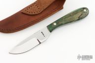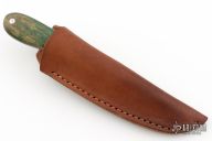 This Utility by Manley has a mirror polished blade with notched thumbrest, .137" blade stock and .909" depth, full tang construction. The handle has sycamore wood scales with nickel silver pins. Comes with a brown leather sheath. Dated '25 and #1798. Excellent condition.