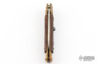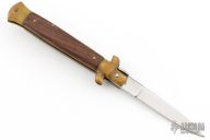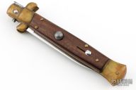 This swivel bolster auto by C Jul Herbertz features a mirror polished blade. The handle has brass bolsters, front and rear, wood scales and brass liners. Strong opening. Has safety. Has scuffs, scratches, and patina. Good condition otherwise.