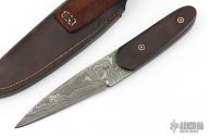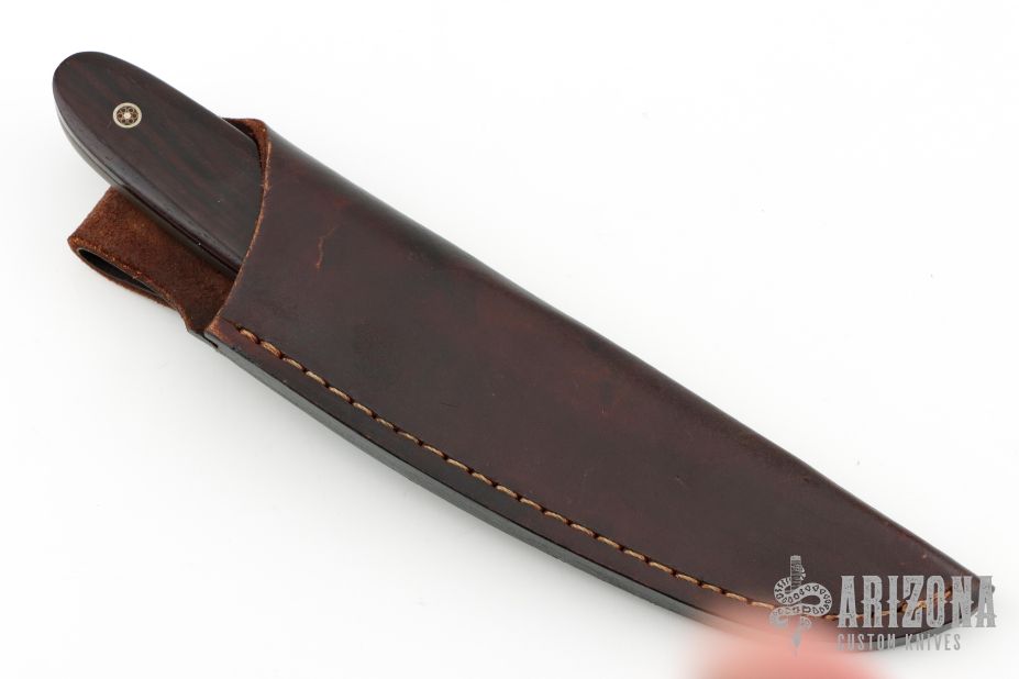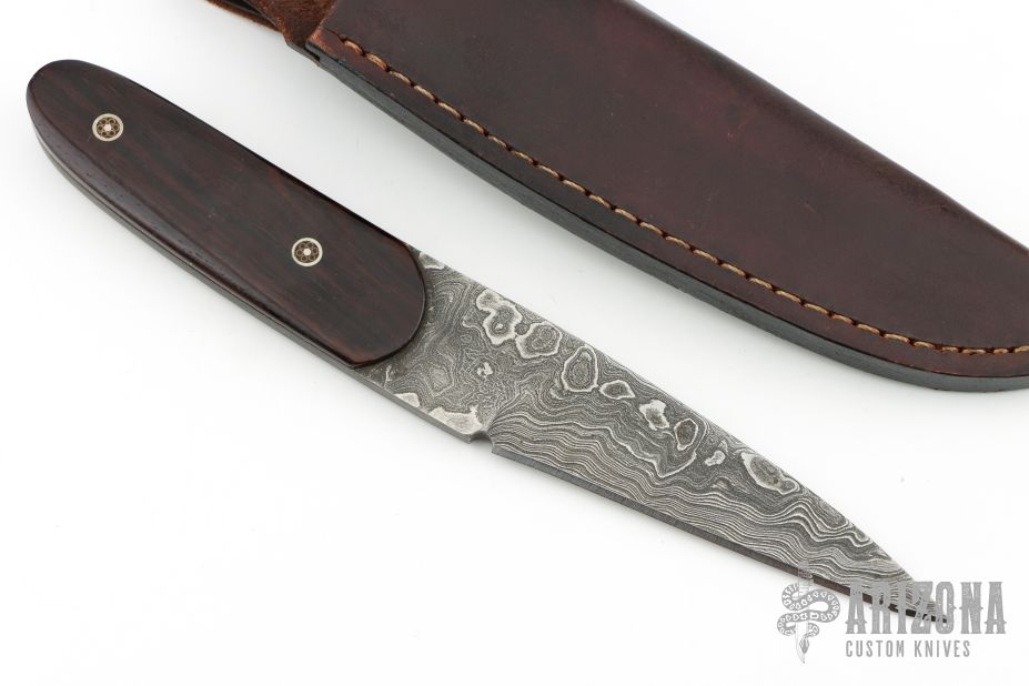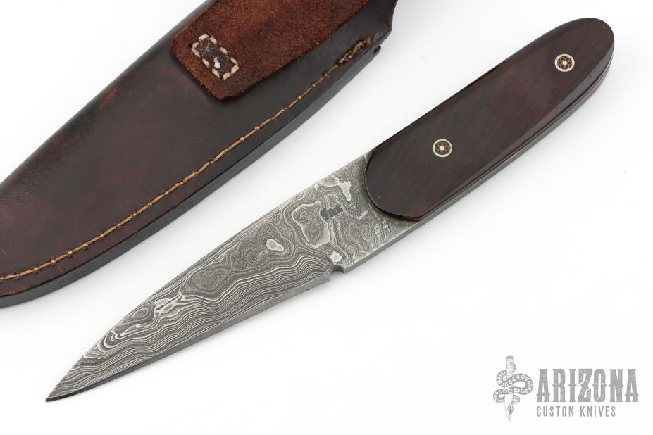 This knife by Stek Knives features a Damascus blade with .195" blade stock and 1.189" blade depth, full tang construction. The handle has cocobolo scales with mosaic pins. Comes with a brown leather sheath with belt loop. Excellent condition.