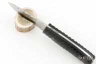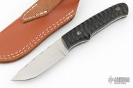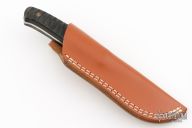 This knife by Vern's Knives features a mirror polished blade with fileworked spine, .140" blade stock and 1.044" blade depth, full tang construction. The handle has buffalo horn scales with mosaic pins. Comes with a brown leather sheath. Appears to have been resharpened, otherwise excellent condition.