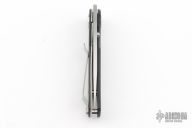 This knife by AG Russell features a satin finished blade with false top edge and single thumb stud. The handle has carbon fiber covers, titanium liner, titanium posts, and tip up stainless clip. There are some scuffs, and scratches, on the blade and handle. There are also some light rust spots. Good condition otherwise.