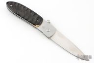 This linerlock folder from Mel Pardue features a hand rub satin finished blade with a false top edge and dual thumbstuds. The handle has hand rub satin finished stainless liners with jeweled interiors, stainless backspace, and horn covers. Nice lockup. Blade favors the right side, and touches the backspacer. Excellent finish work. Comes in a soft pouch. The knife has some light scuffs and scratches, great condition for its age, and otherwise.