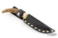This Skinner by Sheldon Jones features satin finished blade, .185" blade stock and 1.311" blade depth, hidden tang construction. The handle has a brass guard and a stag tine grip. Comes with a black leather sheath. Has some scratches and patina, good condition otherwise. "N2_29_120" on the blade.