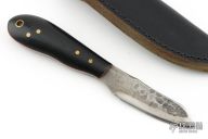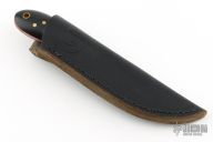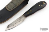This patch knife by Frank "Woody" Bridwell features a hand forged blade with .110" blade stock and .811" blade depth, full tang construction. The handle has black linen micarta scales with red liners and brass pins. Comes with a black leather sheath. Excellent condition.