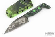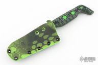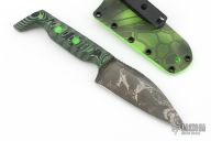 This knife (please let us know if you know who made this knife) features an acid etched blade with fileworked thumbrest, .134" blade stock and 1.256" blade depth, full tang construction. The handle has black/green G-10 scales with green G-10 pins. Comes with a kydex sheath. Has some light scratches, otherwise excellent condition.
