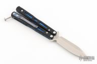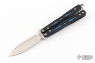 This Model 32 Morpho Balisong by Benchmade has a stonewashed spear point D2 stainless steel blade. Handle is black G-10 with blue anodized titanium liners and milled stainless steel spacers. Blue anodized titanium tip up clip. Comes in a zipper case. Has some scuffs and scratches on the clip and blade. Great condition otherwise.
