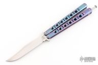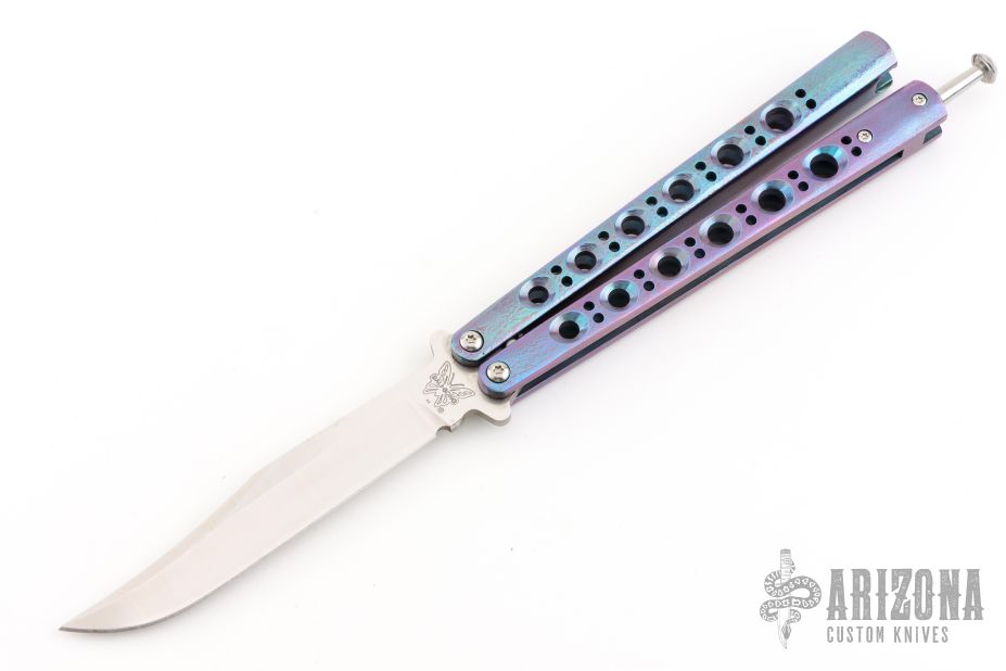 This Model-43 by Benchmade features a tumble finished clip point blade with false top edge. The handles are orange peel finished and anodized titanium with a spring latch. Comes in a zipper case, and with the original nylon belt sheath. Excellent condition.