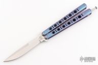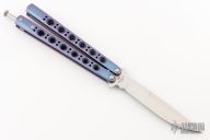 This Model 42A Balisong features a tumble finished blade and anodized titanium handles with an orange peel finish. Has spring latch. Comes in a zipper case, and also includes original nylon belt sheath. Has a couple scuffs near the latch closure, otherwise excellent condition.