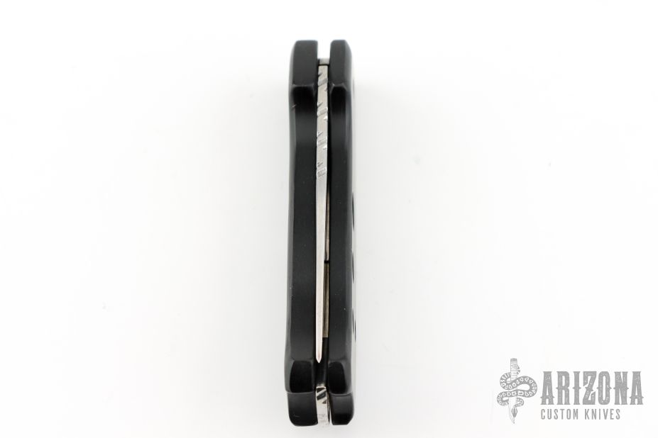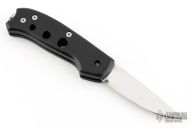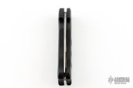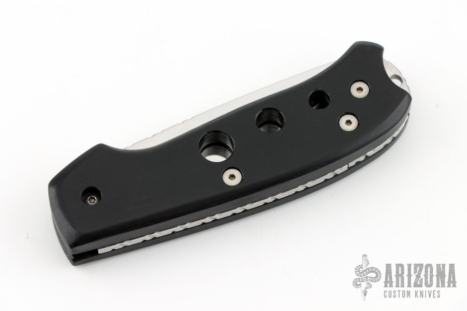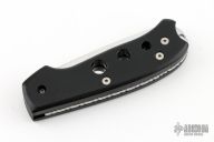 This scale release auto by Whiskers features a mirror polished drop point blade with a file-worked spine. The handle has black aluminum scales and a polished and file-worked stainless steel back-spacer. There is a lanyard bail at the pommel. Comes in a zippered case. There are a couple very light scratches, excellent condition otherwise.