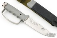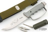 This Explora Survival Knife by Marto-Brewer features a mirror finished blade with sawteeth on the spine, .144" blade stock and 1.359" blade depth, hidden tang construction. The handle has a removable steel D-guard, hollow aluminum grip, stainless steel butt cap with compass. The handle holds survival items in a tube, hooks, matches, weights, etc. Comes with original scabbard, box and instruction booklet. Has some scuffs, otherwise excellent condition for its age. #E-4091