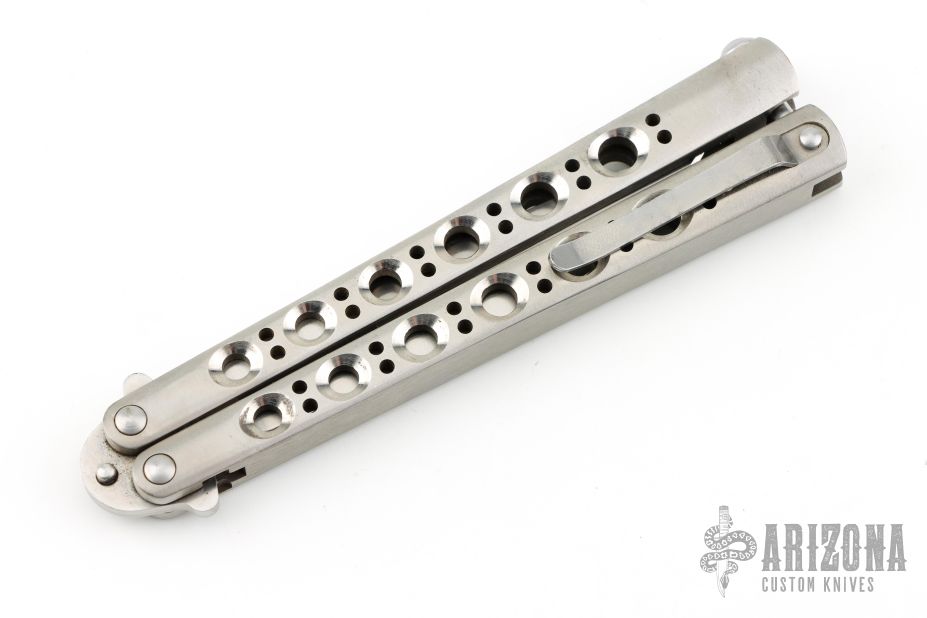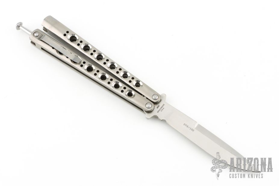 This Model 42C Balisong by Benchmade features a tumbled blade. Satin finished titanium handles with spring latch and tip up clip. Comes with original box and papers. Excellent condition. #98/100
