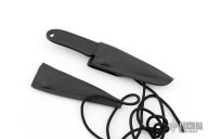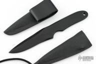 This is a Small Frequent Flyer from Mad Dog Knives. Blade and handle are black G-10 and non-magnetic; .250" thickness. 1.270" blade depth. Fits well in the hand. Includes a kydex neck sheath and a Kydex belt sheath. Excellent condition.