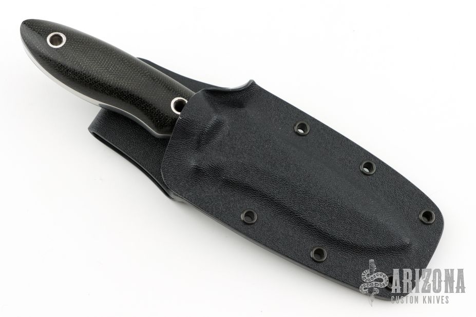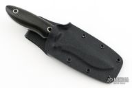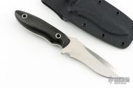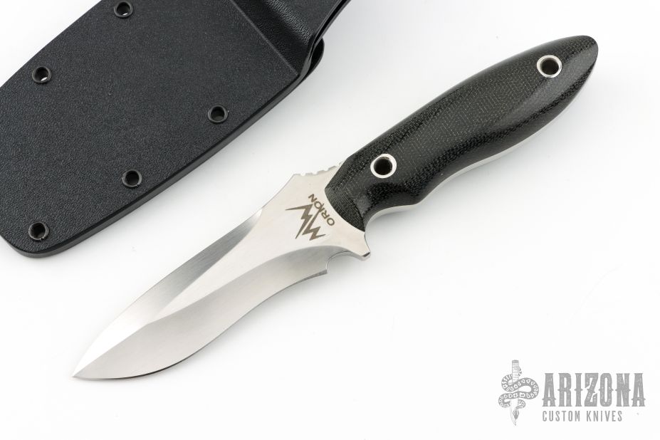 This Orion from Mercworx features a hand rub satin finish blade with false top edge and notched thumb ramp, .199" blade stock and 1.271" blade depth. The handle has black canvas micarta scales over full tang construction with hollow pins. Includes a kydex sheath. Has some light scratches, otherwise excellent condition.