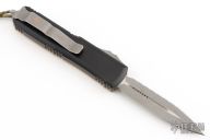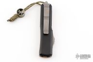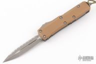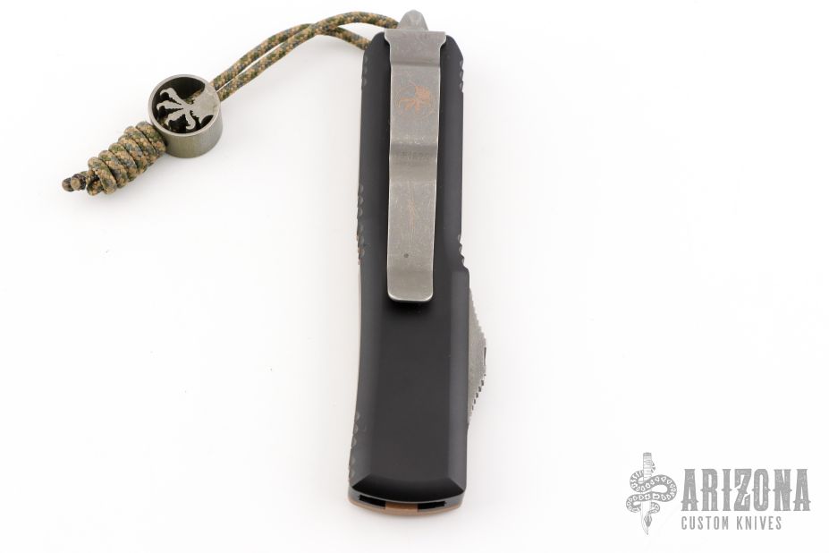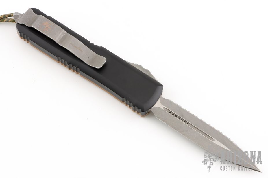 This UTX-85 OTF automatic by Microtech knives features a D/E Apocalyptic finished double-edged blade with a fully serrated edge. The handle has a black aluminum handle with tan G-10 top, apocalyptic hardware, tip down carry. Glass breaker. S/N 041. Dated 06/2021. Comes with original box and papers. Excellent Condition.