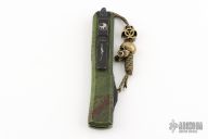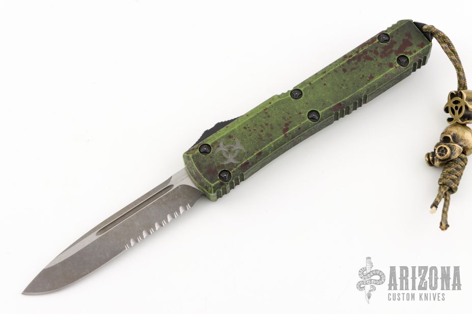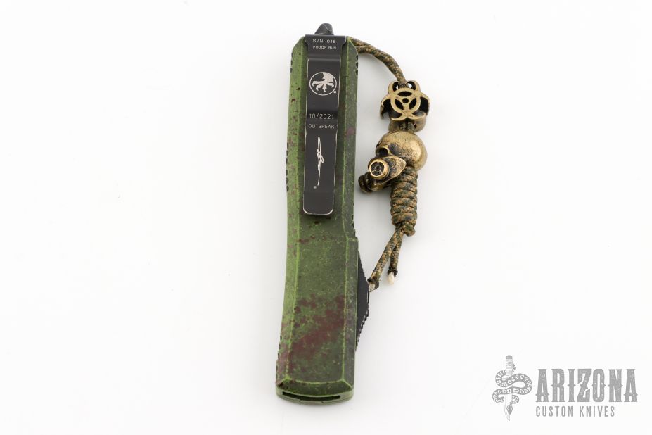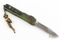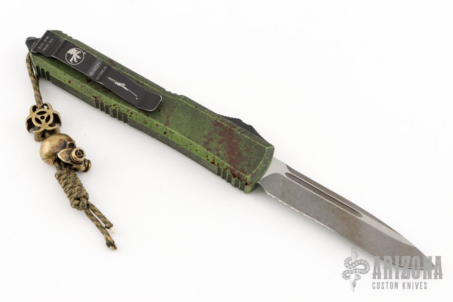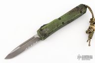 This Ultratech OTF automatic by Microtech features a S/E black blade with a partially serrated edge. Distressed green aluminum contoured frame with black hardware and tip down stainless steel clip. Dated 10/2021 and s/n 016. Includes original box and papers. Excellent condition.