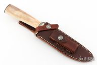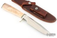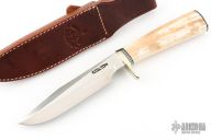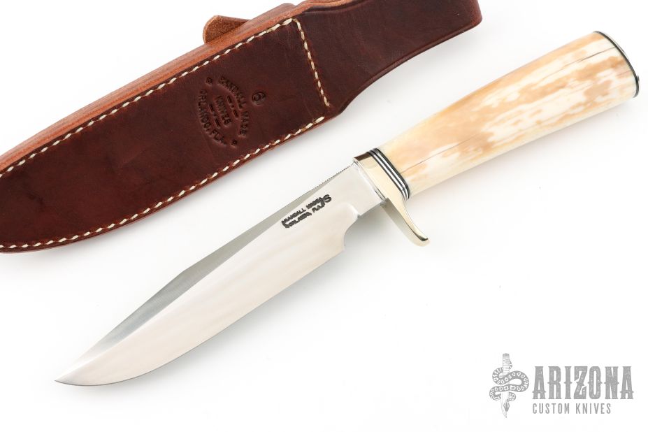 This Model 5 Camp and Trail Knife by Randall Made Knives features a satin finished blade with false top edge and notched thumbrest, .222" blade stock and 1.192" blade depth, hidden tang construction. The handle has a nickel silver guard and butt, fossil walrus ivory grip with black/duralumin spacers. Comes with a brown leather sheath with belt loop and a zippered case. Has some naturally occurring cracks in the grip that have been stabilized, there are no open cracks, otherwise excellent condition.