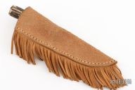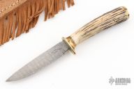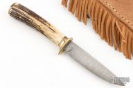 This hunter by Bill Behnke features a Damascus blade with .109" blade stock and .693" blade depth, hidden tang construction. The handle features a brass guard and butt, black/brass spacer pattern, and pinned sambar stag handle. Great look and feel. Comes with brown leather sheath. Has some scuffs, and patina. Great condition otherwise.