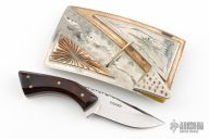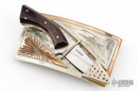 This custom belt buckle knife features a .118" mirror polished blade. .724" blade depth. Filework down the spine. Wood scale with brass pins. The belt buckle is made from copper, brass, and nickel silver. Buckle has some scuffs, scratches, and patina. Knife has some scuffs, and scratches. Great condition for its age.