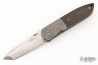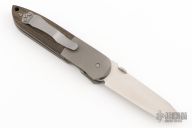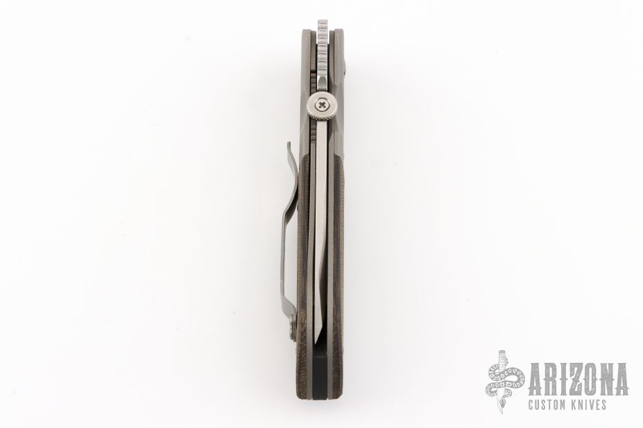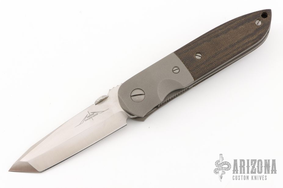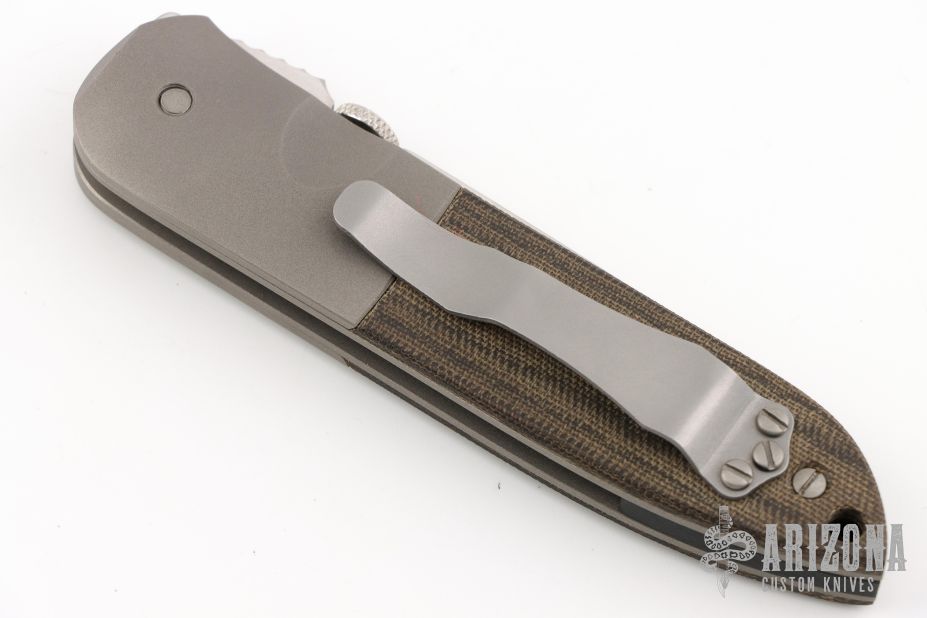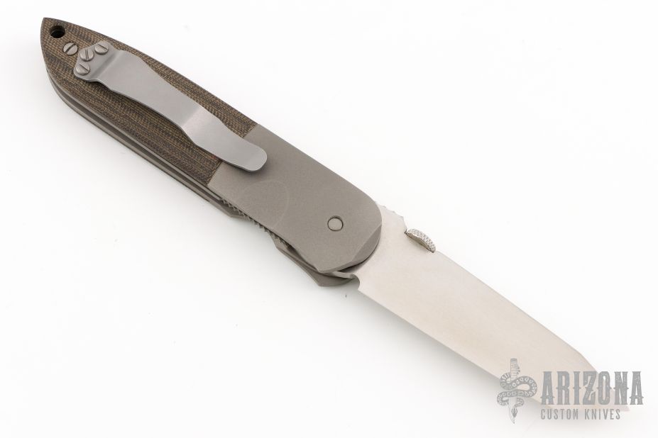 This "Garage Period" CQC-6 by Ernie Emerson has a satin finished chisel ground tanto blade with notched thumbrest, thumbdisc, and heavy buffing line. Handle has green canvas micarta scales with bead blasted and dovetailed and threaded titanium bolsters, over bead blasted titanium liners, stainless steel tip up clip, black G-10 backspacer, and lanyard hole. Nice detent, lockup and blade seating. Has a couple light scuffs, otherwise excellent condition. Comes with a zippered case.