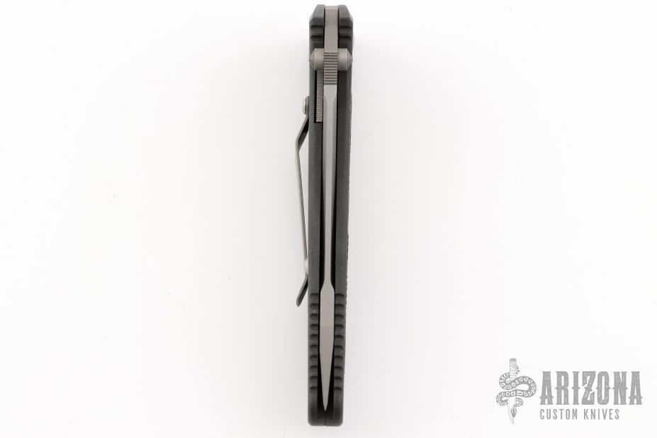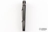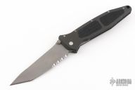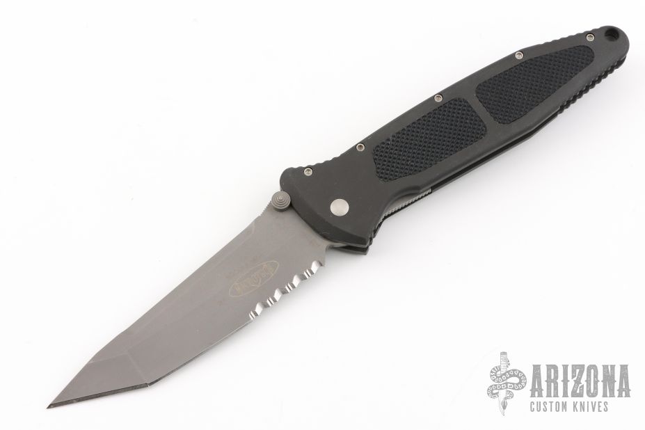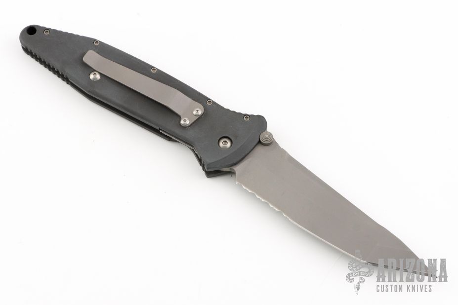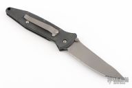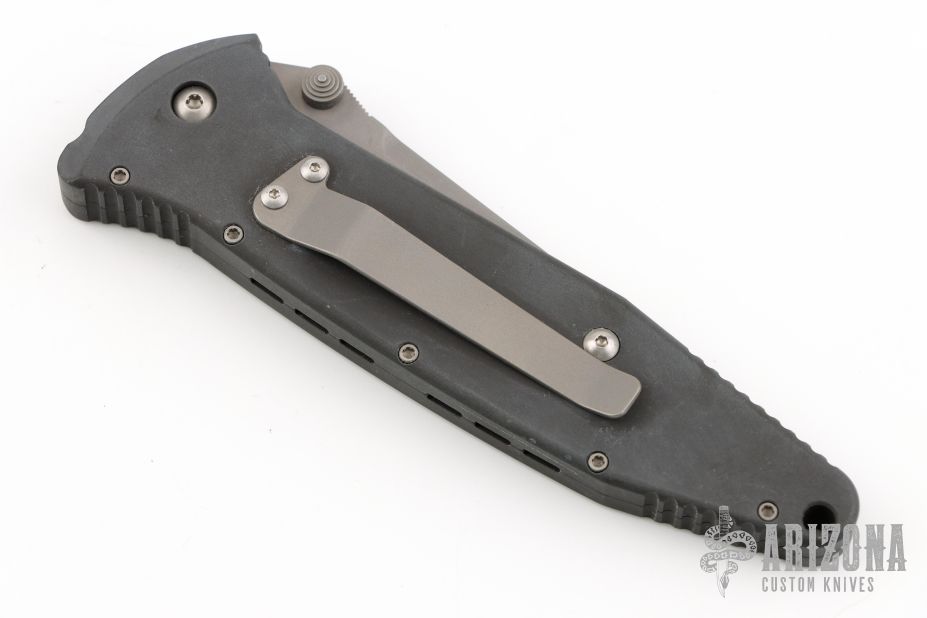 This manual Socom liner lock folder by Microtech features a fine bead blast partially serrated edged tanto blade with notched thumbrest and dual thumbstuds. The handle has a black anodized aluminum frame with non-slip inlays. S/N 189 Dated 2/97. Comes with original box and papers. Has a couple light scratches, otherwise excellent condition.