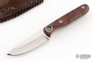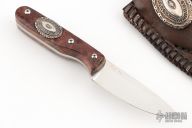 This neck knife by ALM features a mirror polished blade and tang, .129" blade stock and .706" blade depth, full tang construction. The handle has wood scales. Comes with a brown leather neck sheath with kydex inside that has a button snap to hold the knife in place. Has a few light scratches, otherwise excellent condition.