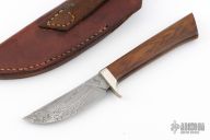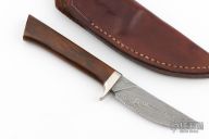 This Knife by Tim Zowada has a Damascus drop point blade with .132" blade stock and .836" blade depth, hidden tang construction. The handle has a nickel silver guard and wood grip. Comes with a brown leather belt sheath. Has a few light scratches and patina, otherwise excellent condition.