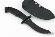 The Warrior fixed blade is one of the world's most intriguing combat knives. Based largely on the groundbreaking research of close-combat icon Michael Echanis, the original Warrior was a radical design intended primarily for use with reverse-grip tactics inspired by the Korean martial art of HwaRangDo. Produced in limited quantities by the late Al Mar and later resurrected by the martial artist Bob Taylor and Echanis contemporary Randy Wanner, it is one of the most coveted combat knives ever made. The Spyderco Warrior faithfully retains all the salient features of the original, while adding a number of performance enhancements. Its revitalization happened at the request of our Israeli customer, Guy Rafaeli. Ground from rust-free austenitic H-1 steel, it possesses the same differential hardness properties of a clay-tempered Samurai sword, giving it extreme cutting power and shock resistance. Its full-tang construction and textured handle scales provide a superior grip and edge orientation, maximizing the knife's effectiveness when employed with its signature tactics. The sheath is a black ballistic nylon snap-closed sheath with Molle-vest attachment capability. Comes with nylon sheath. Has some light scuffs, otherwise great condition.