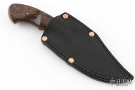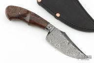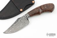 This Knife by Jan Hafinec features a clip point Damascus blade with a sharpened top edge, .244" blade stock and 1.826" blade depth, hidden tang construction. The handle has an integral Damascus guard with a nicely sculpted stabilized Burch burl grip. Comes with a black leather sheath. New from maker.