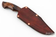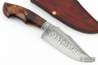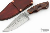 This Knife by Jan Hafinec features a clip point blade (C105 Carbon Steel) with a sharpened top edge and beautiful hamon, .242" blade stock and 1.988" blade depth, hidden tang construction. The handle has an integral guard with a nicely sculpted desert ironwood burl grip. Comes with a brown leather sheath. New from maker.