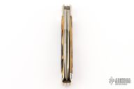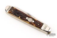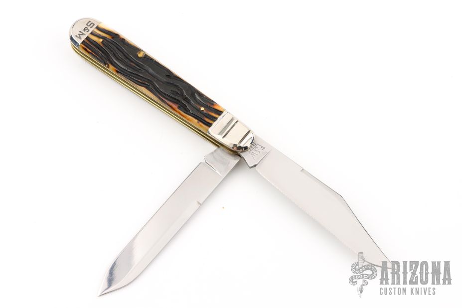This knife by Schatt & Morgan features 2 mirror polished blades with nail nicks. The handle has nickel silver bolsters, brass liners, jigged bone covers and stainless springs.  Includes the original box and paper. Has a couple light scratches, Excellent Condition.