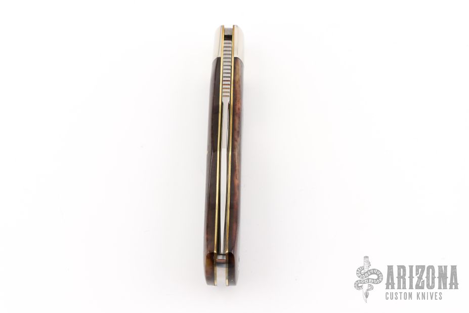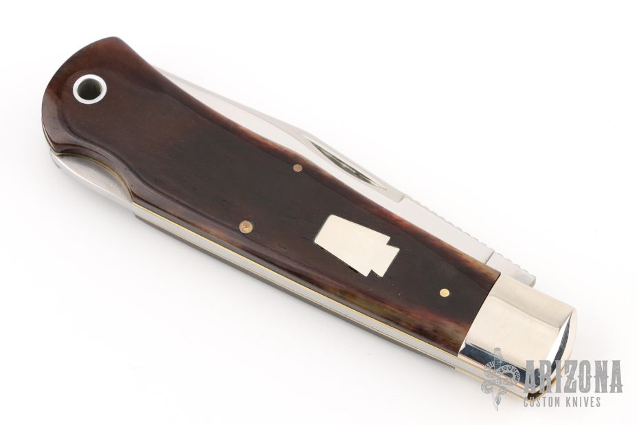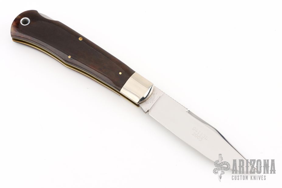 This lockback from Schatt & Morgan features a mirror polished clip point blade with a notched thumbrest and nail nick.  The handle has nickel silver bolsters and bone scales over brass liners with steel backspring. Comes with original box and paper. Has a couple light scratches, otherwise Excellent Condition.