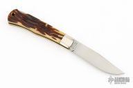 This Trapper by Northfield Knives features a satin finished blade with nail nick. The handle has nickel silver bolsters, grizzly cut bone covers with a nickel silver escutcheon, brass liners/pins.  Comes with original tube. Excellent condition. 227 Made