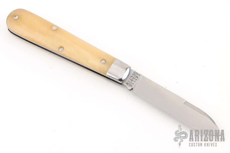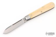 This Tidioute Cutlery 142116 Lick Creek Boy's Knife by Great Eastern Cutlery features a satin finished spearpoint blade with swedge and long pull. The handle has steel bolsters, smooth ivory bone covers and steel pins over steel liners and backspring. This knife features a half stop. Includes original tube. Excellent condition. 50 were made.