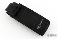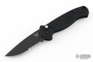 This 9051 AFO II auto from Benchmade has a black spear point partially serrated blade with false top edge. Black anodized aluminum handle. Integrated safety system. Black stainless steel clip - 4 way reversible, and lanyard hole. Comes with original box, sheath and papers. Excellent condition.