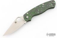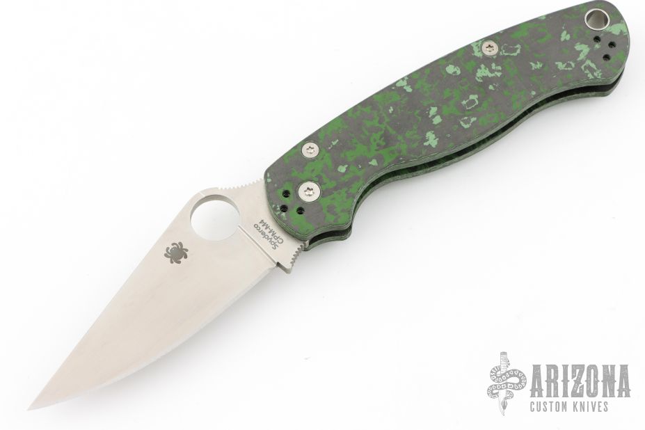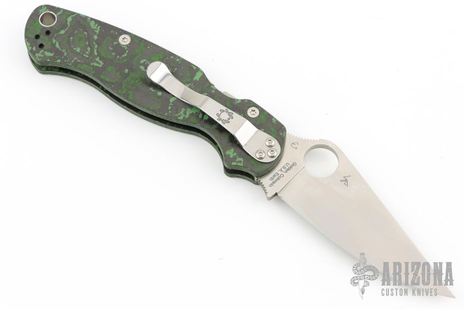 This Paramilitary 2 Linerlock Folder from Spyderco has a satin finished clip point blade with thumb hole and notched thumb rest. Handle has black/green Fat Carbon scales with stainless steel liners and stainless steel 4-way reversible clip. Comes with original box and papers. New condition.