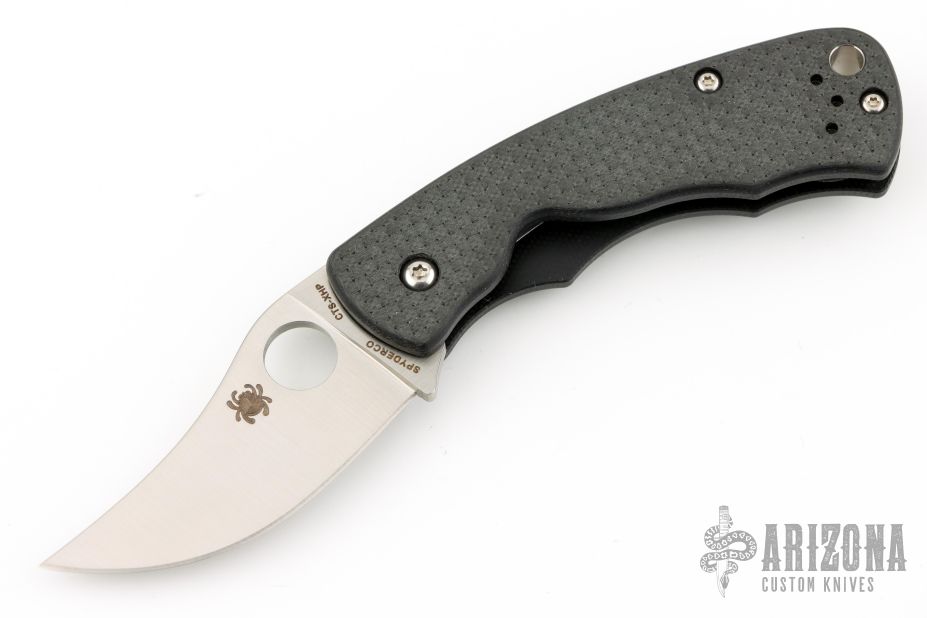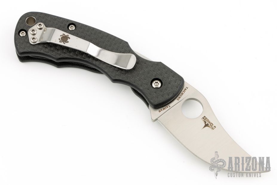 This Rhino by Spyderco is a Reinhold design, it features a satin finished blade with thumbhole. The handle has carbon fiber scales with an inlaid stainless steel liner that releases from the spine, tip up reversible stainless steel clip. Comes with original box and papers. New condition.