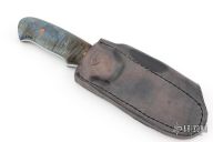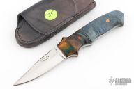 This knife by Mark Hazen features a mirror finished blade with a sharpened top edge, .202" blade stock and .933" blade depth, full tapered tang construction. The handle has a copper guard, nice wood scales with copper pins. Comes with a leather sheath and original box. Has patina, and some scuffs/scratches. Great condition otherwise.
