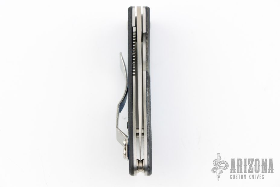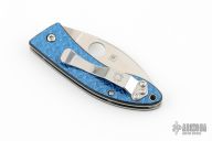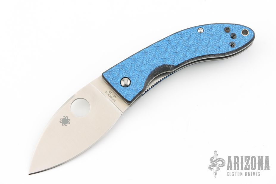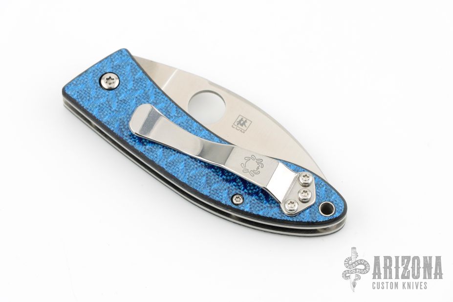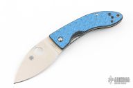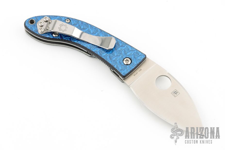This Lil Lum Chinese folder from Spyderco has a satin finished blade with thumbhole and false top edge. The handle has blue carbon fiber scales, stainless steel liners, and a stainless steel tip up reversible clip. New condition. Comes with original box and papers.